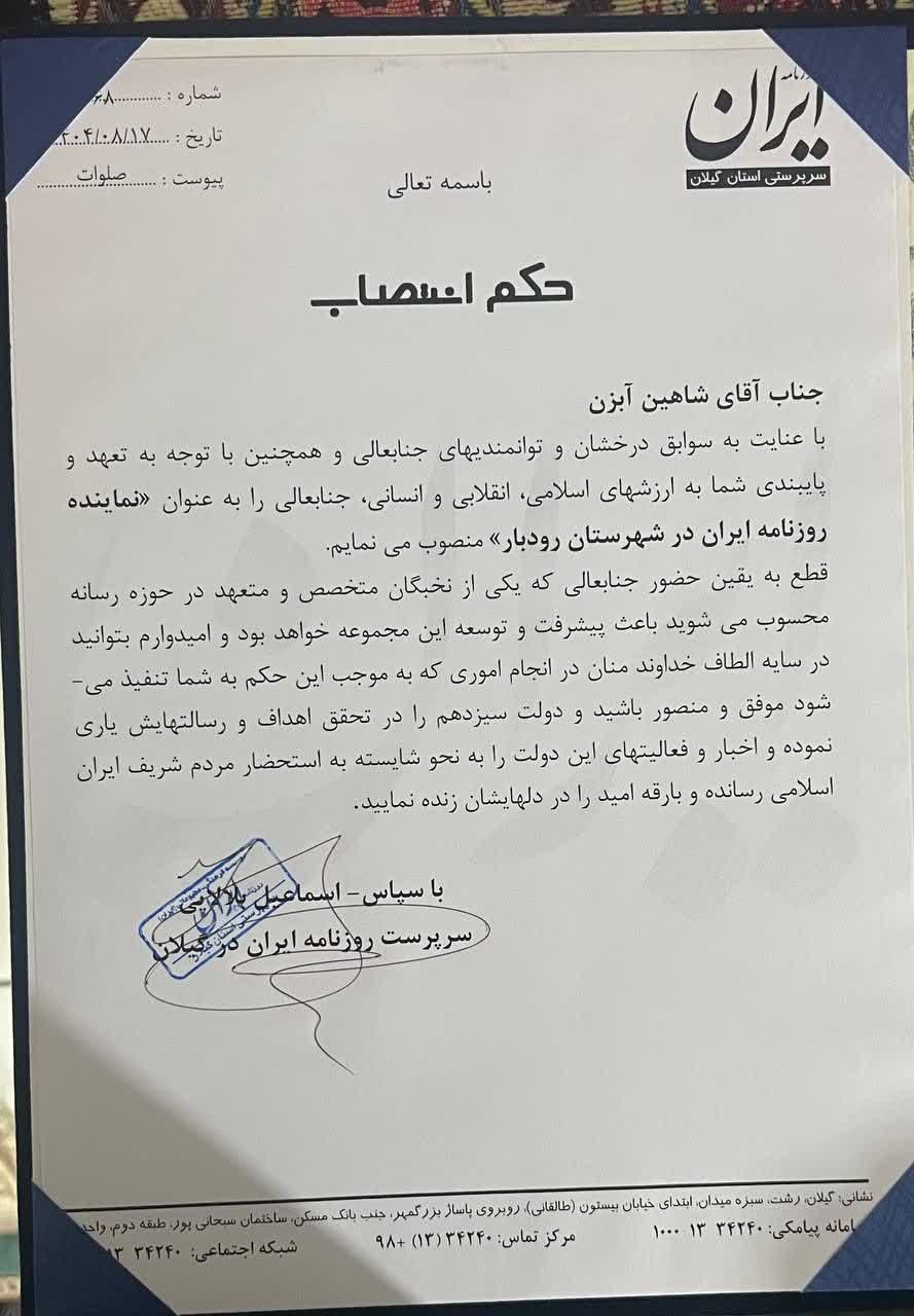 در خاتمه این نشست حکم انتصاب شاهین آبزن به عنوان نماینده رسمی روزنامه سراسری ایران با حضور مهندس پورحضرت فرماندار شهرستان رودبار، معاونین فرمانداری و بلالایی سرپرست روزنامه ایران در استان گیلان به وی اهدا شد.